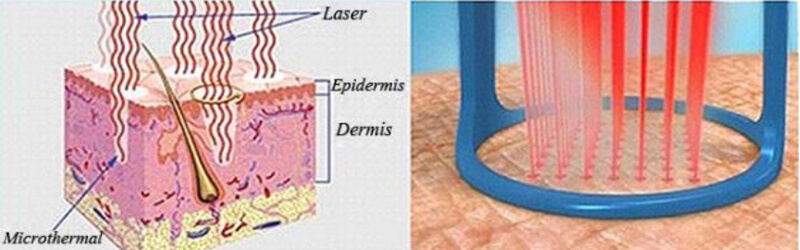 The wavelength of CO2 laser is 10.6μm, which can be fully absorbed by human biology tissue (all the skin are available). The sealed-off fractional CO2 laser, whose output laser-light will be transferred by articulated arm, which has better sense of direction and higher energy density. The CO2 laser operates in the invisible infrared waveband, and an aiming beam is required to see where the treatment beam will impact tissue more recently from a visible red diode laser. When the laser beam go through the focus lens, the produced heat will gasify the target tissue.